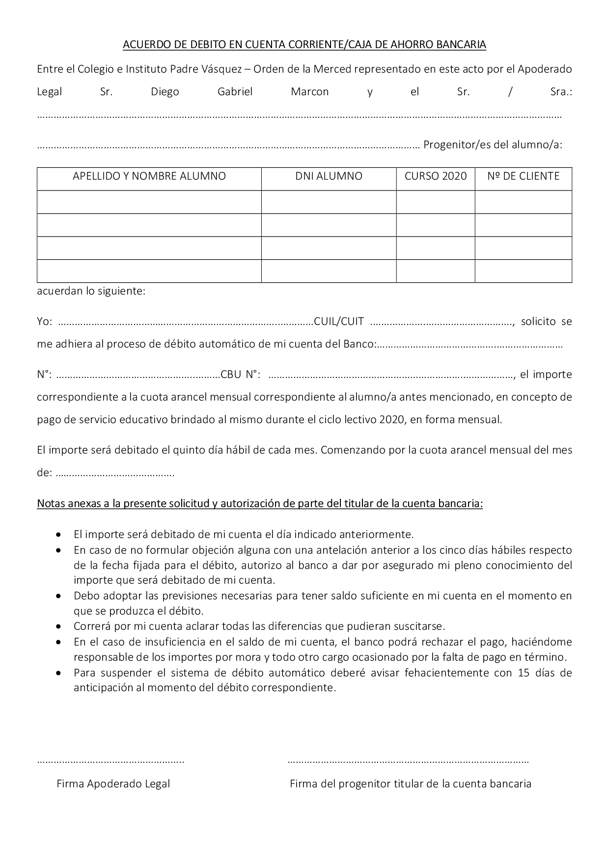 3-“Débito directo en cuenta“, para utilizar esta opción debe completar el archivo de “Acuerdo de débito automático” y devolverlo firmado (escaneado o por foto) junto a copia del documento y constancia de CBU emitida por el banco, al correo cobranzas@padrevasquez.com.ar